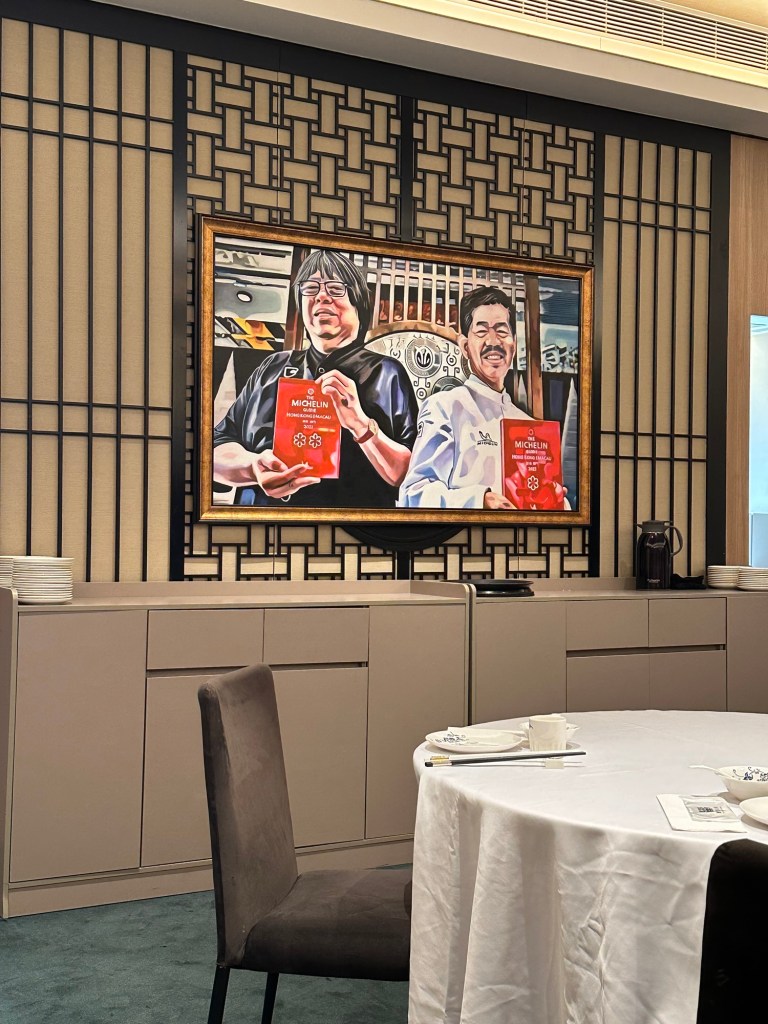 店内には、ミシュラン星獲得シェフ、アルヴィン・リョンさん(Alvin Leung、右)と鄭錦富さん(Cheng Kam-fu、左)の絵がありました。