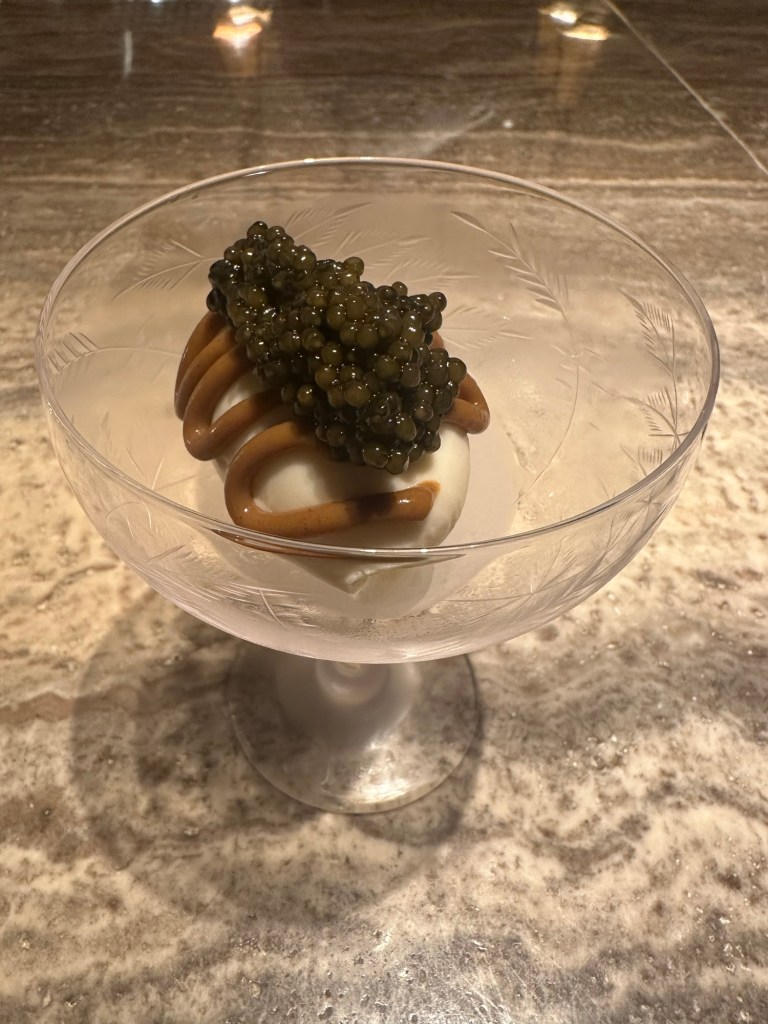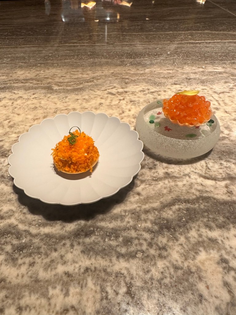 一品目はカマトロと北海道産の赤ウニとキャビアのお料理です。