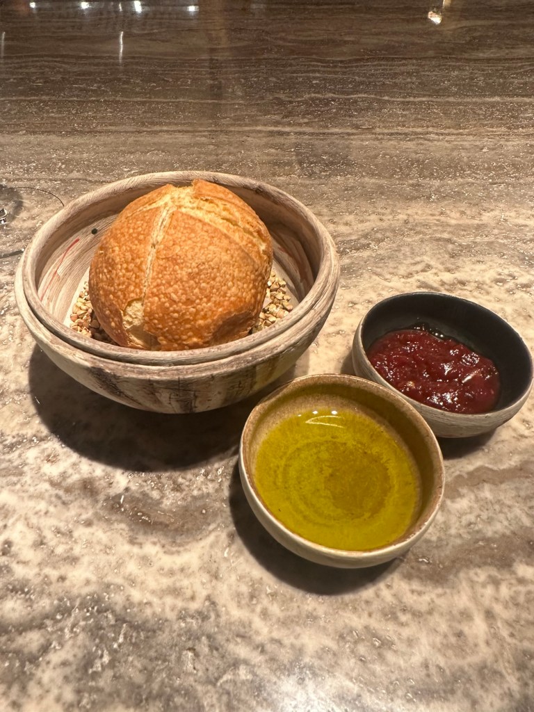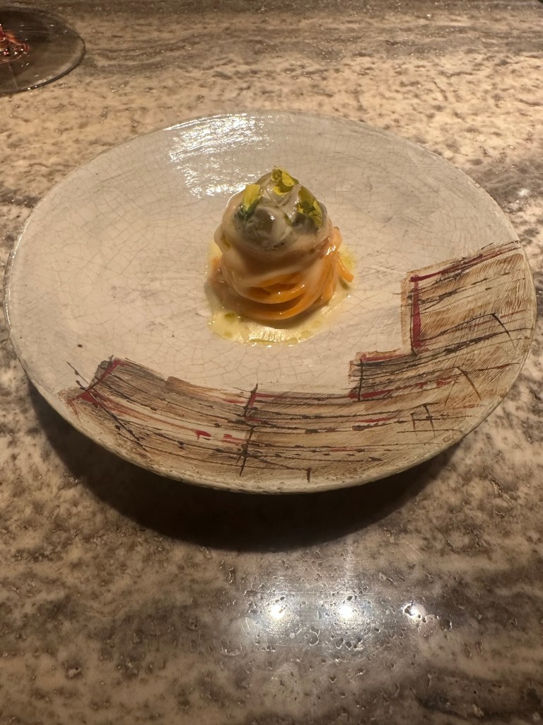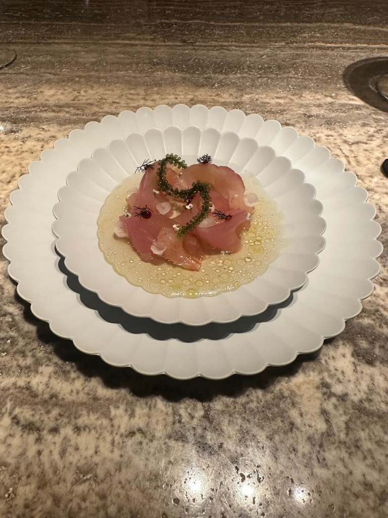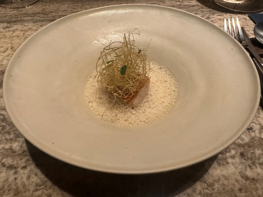 三品目は縞鯵と甘海老です。トマトエッセンスが入っていて、日本人的には想像つかなかったのですが美味しかったです。